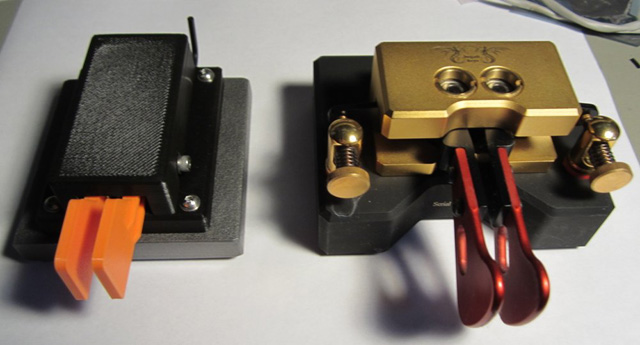 A spring between the levers provides the tension. Two screws allow you to adjust the contact spacing. Unlike the Begali, whose adjustment screws have a very fine thread to give you plenty of adjustability, these screws are standard thread screws. What this means is that it can be a bit tricky to set the contact spacing. The screws are spring-loaded to prevent the adjustment from changing, but the springs don't seem to be very beefy, and I can see where the adjustment might change after a lot of use.